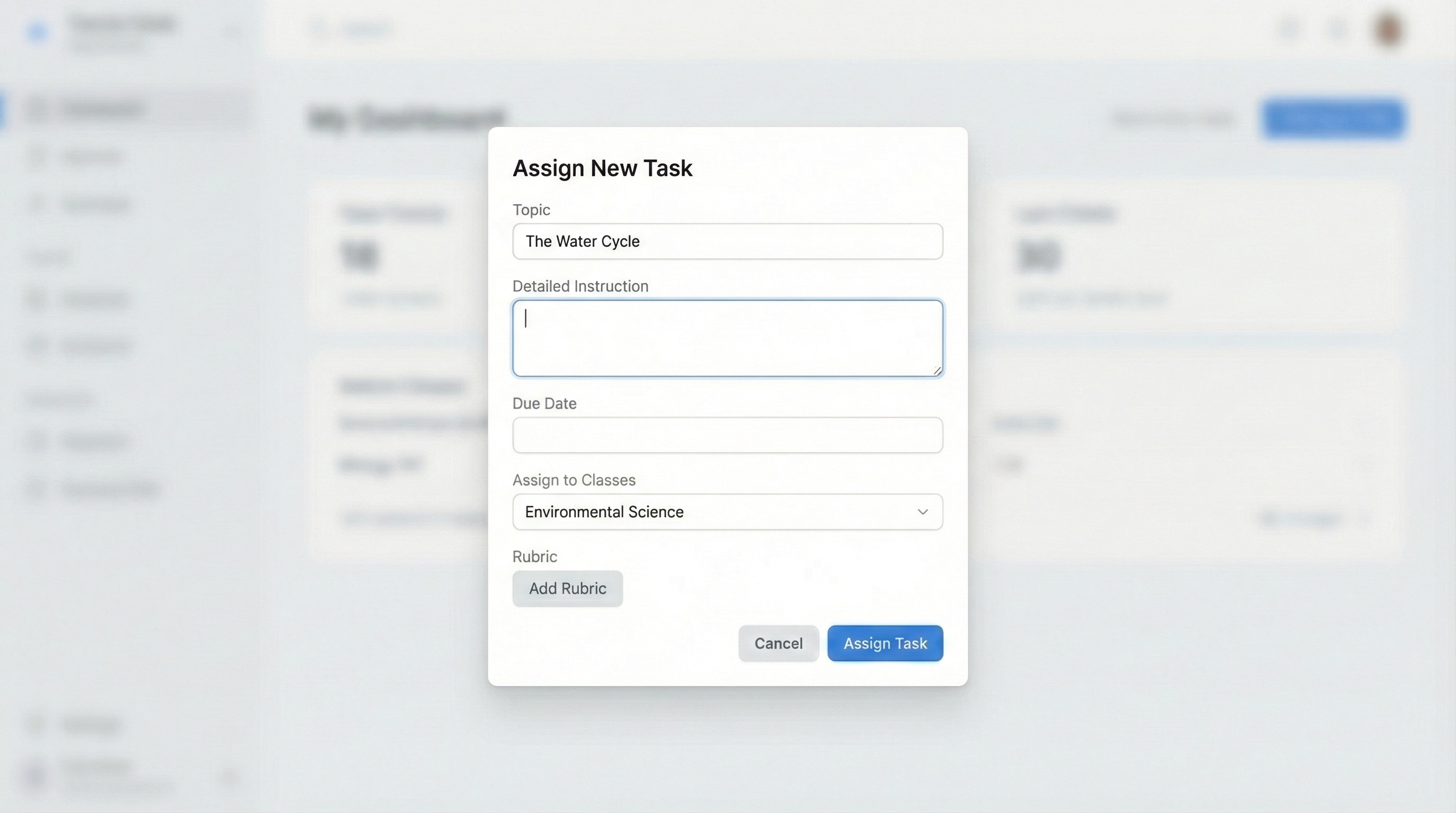 Bepaal het onderwerp, kies de klas, definieer criteria en selecteer de ingebouwde rubric. Ons platform neemt het vanaf daar over